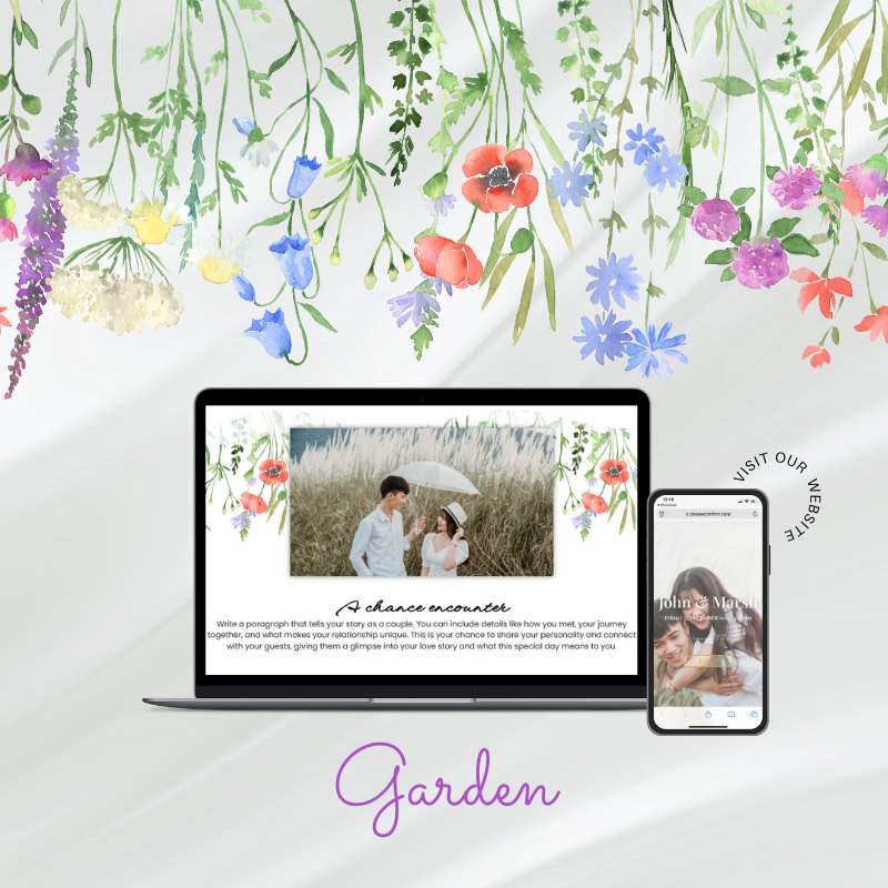 A fresh and enchanting garden-inspired design with soft greens, floral accents, and natural textures, bringing a romantic and airy feel perfect for weddings and celebrations.