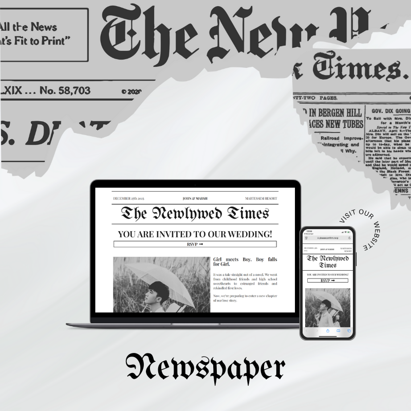 A nostalgic vintage newspaper style featuring classic typography, muted tones, and timeless layouts, giving your wedding website a charming old-world feel with a touch of elegance.